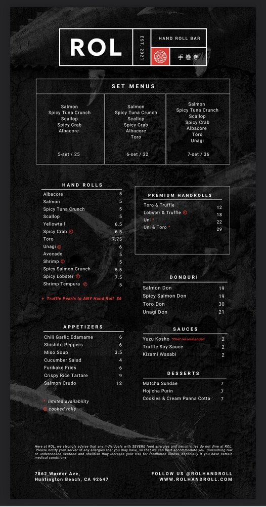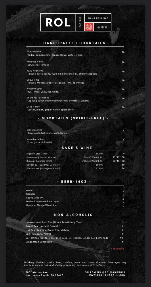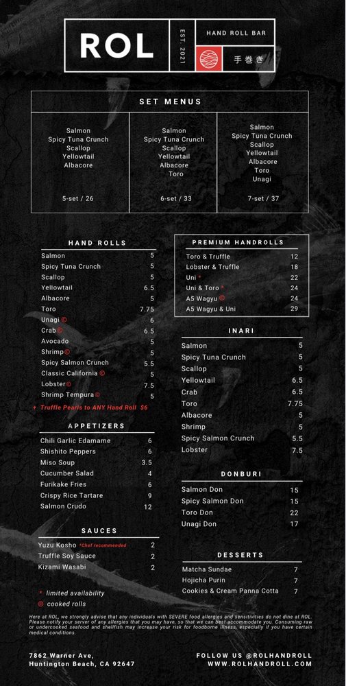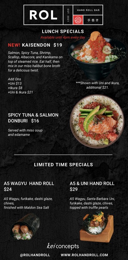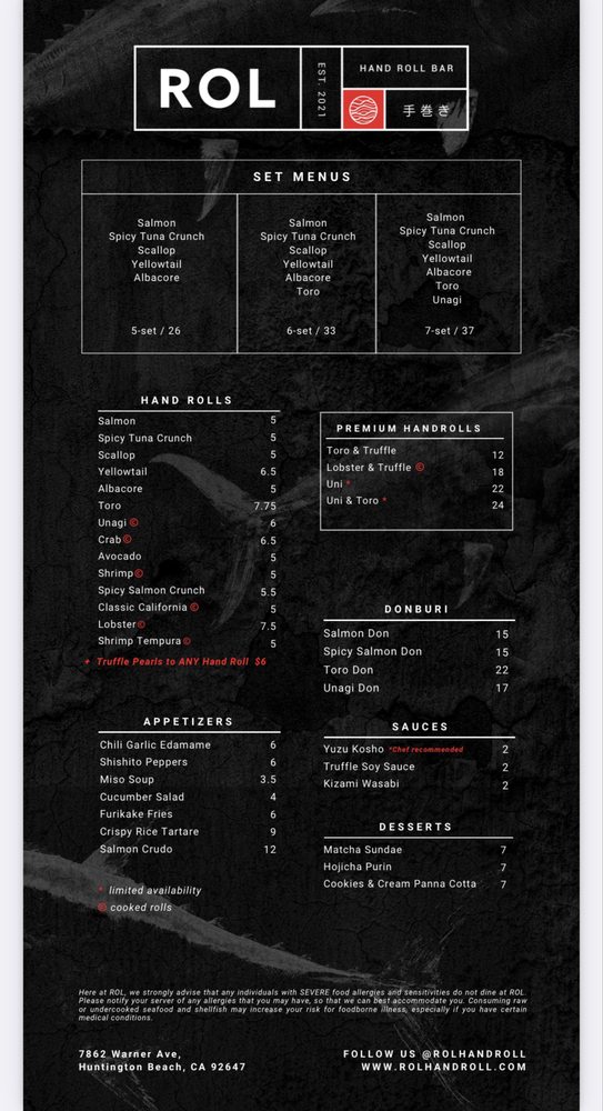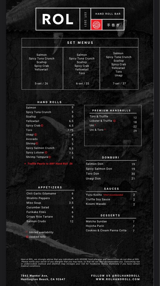 Introducing the menu at ROL Hand Roll Bar by Kei Concepts, an Asian-owned sushi and cocktail bar in Huntington Beach, CA, guarantees a unique dining experience. Offering Pescatarian and Vegan options, this trendy and romantic spot features a Full Bar, Outdoor Seating, and even Dog-friendly areas. With rave reviews from customers praising the freshness of the hand rolls, especially the Unitoro roll, and the delectable combination options like toro and truffle or lobster and truffle, ROL Hand Roll Bar stands out for its top-notch service and consistent quality. Whether enjoying a casual lunch or a special date night, don't miss out on the must-try scallop, salmon, yellowtail, and blue crab hand rolls with truffle sauce. The menu is a fusion of tradition and innovation, ensuring each bite is a burst of flavor and satisfaction.