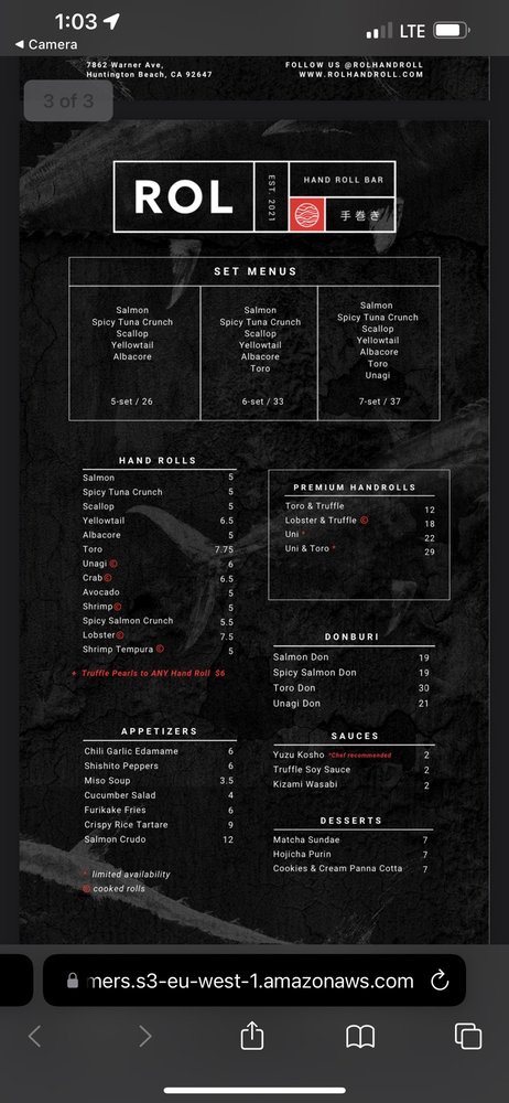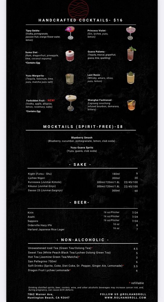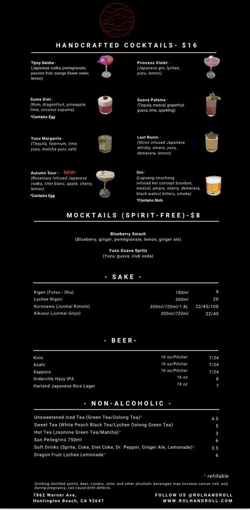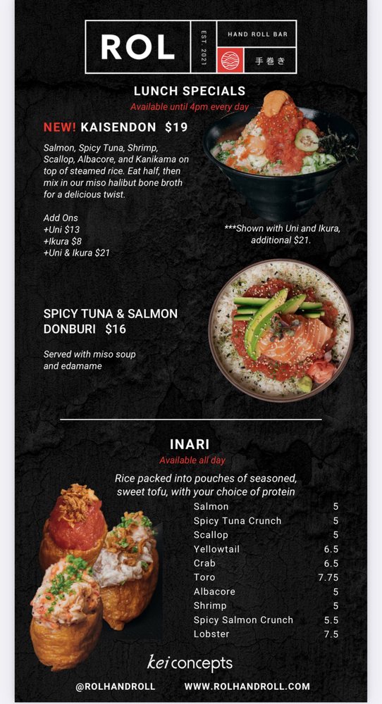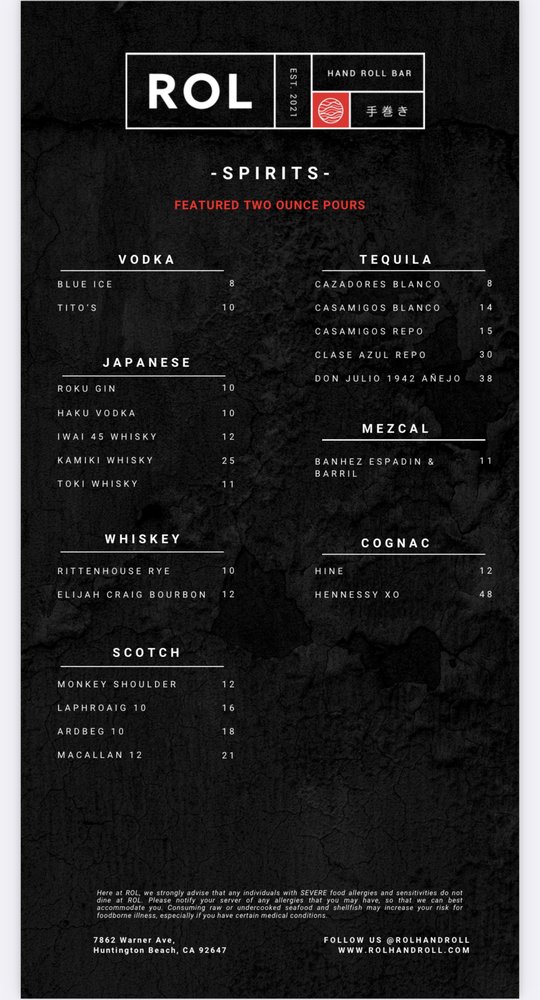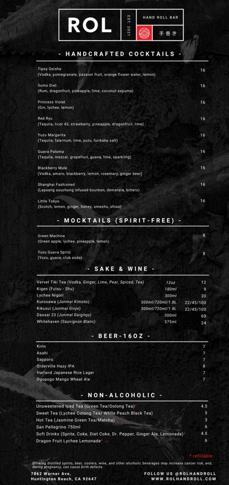 Introducing the menu at ROL Hand Roll Bar by Kei Concepts, an Asian-owned sushi and cocktail bar in Huntington Beach, CA, guarantees a unique dining experience. Offering Pescatarian and Vegan options, this trendy and romantic spot features a Full Bar, Outdoor Seating, and even Dog-friendly areas. With rave reviews from customers praising the freshness of the hand rolls, especially the Unitoro roll, and the delectable combination options like toro and truffle or lobster and truffle, ROL Hand Roll Bar stands out for its top-notch service and consistent quality. Whether enjoying a casual lunch or a special date night, don't miss out on the must-try scallop, salmon, yellowtail, and blue crab hand rolls with truffle sauce. The menu is a fusion of tradition and innovation, ensuring each bite is a burst of flavor and satisfaction.
